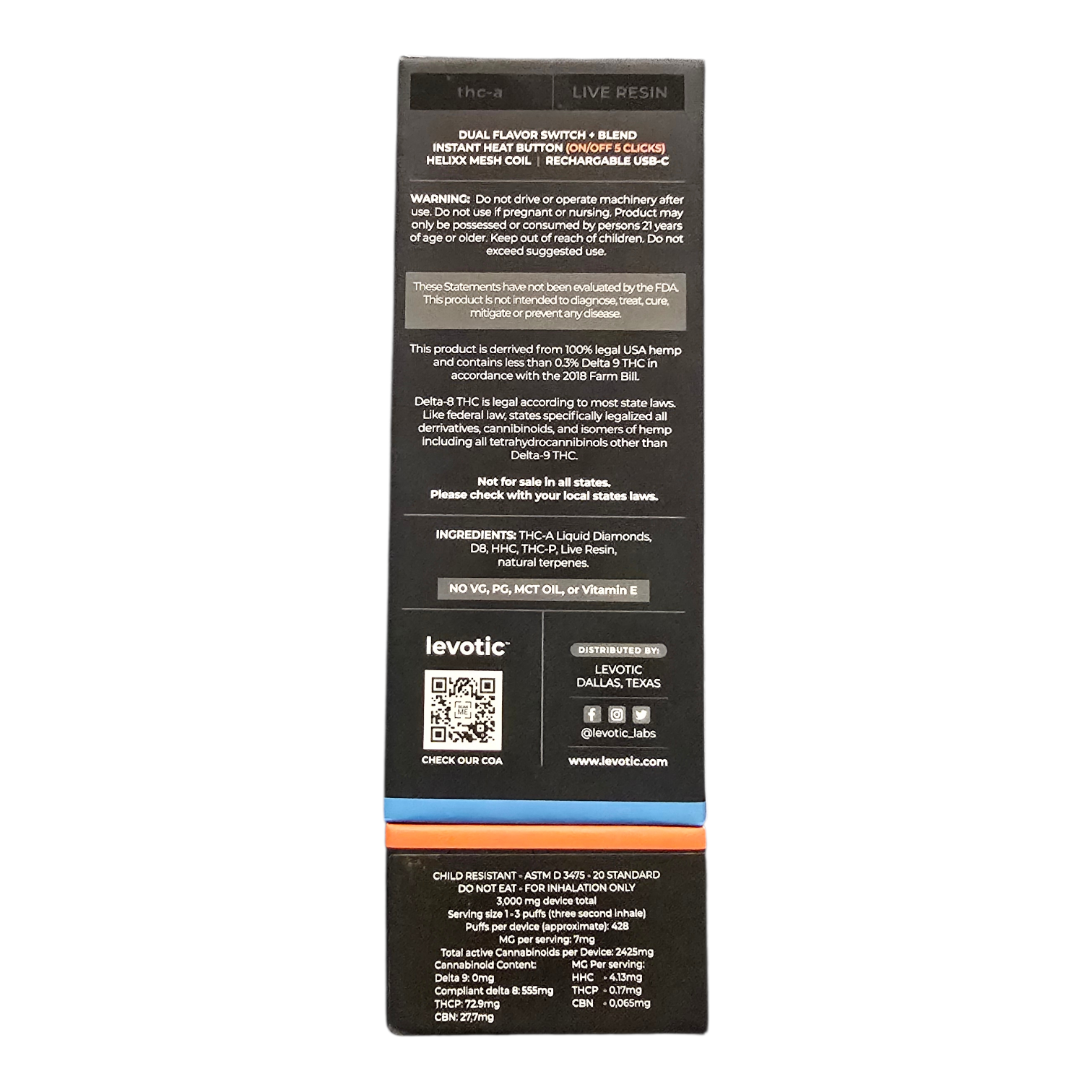 LEVOTIC DISPOSABLE 3GRAM THCA DUAL FLAVOR + BLEND MODE HYBRID BLUE RAZZ / SATIVA TTOPICANA COOKIE